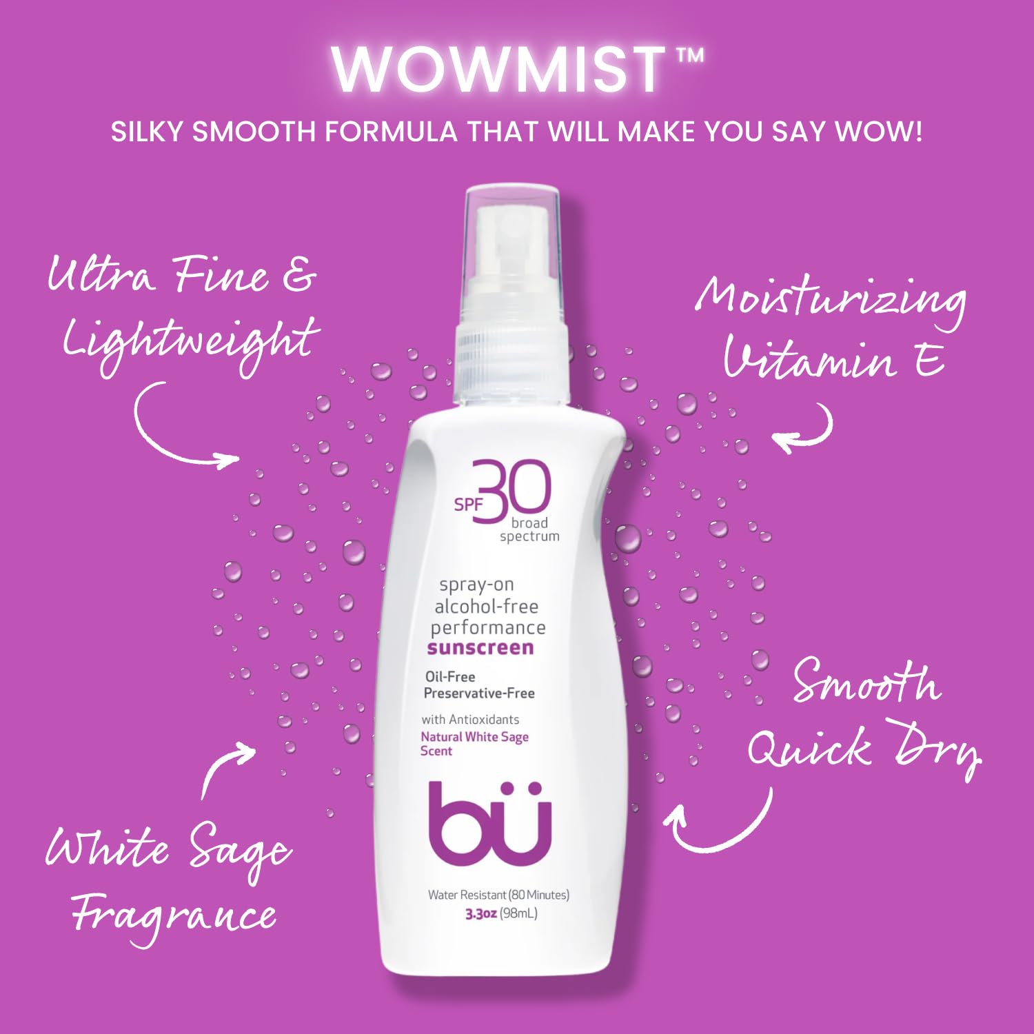 BU SPF 30 Sunscreen Spray for Face and Body, Non Aerosol Spray, Ultrafine WOWmist, TSA Travel Size Sunscreen, Clear, Non Greasy, Water Resistant, White Sage 3.3 oz