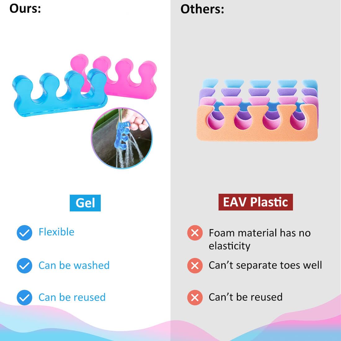 - 🛀【Customers Are Saying】: Our pedicure toe separators: “Soft jelly material”…..“Every comfortable my wife uses them when she does pedicures”……“ These are just as described. They are silicon - sorta reminded me of hard jello. They are easy to put on and are comfortable because of its"squishy" material. I'd suggest putting them on with the bottom of your feet facing you. Would definitely repurchase.”