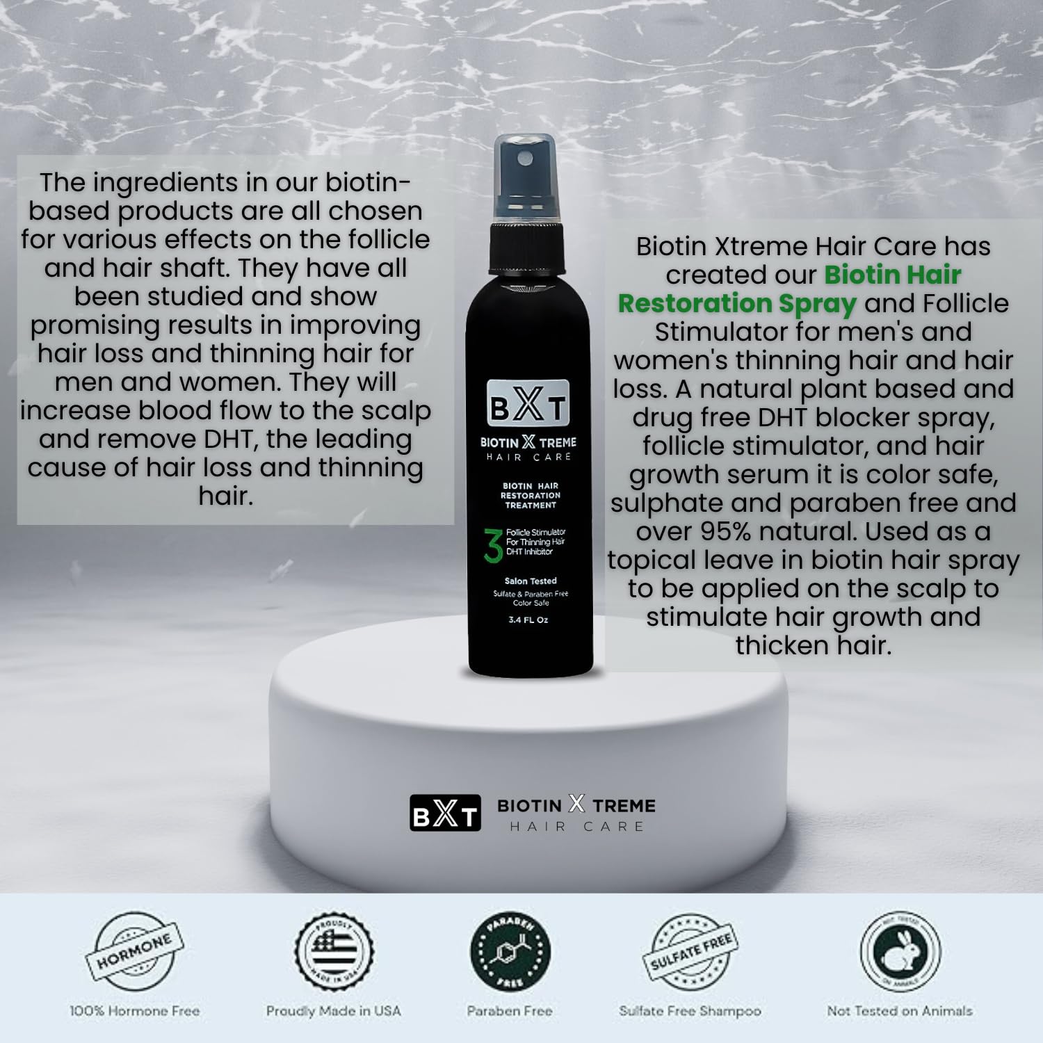 - Natural DHT Blocker: Our Biotin Hair Restoration Spray for men and women is a drug-free solution designed to naturally block DHT, a key contributor to hair thinning and loss, using effective and natural ingredients.