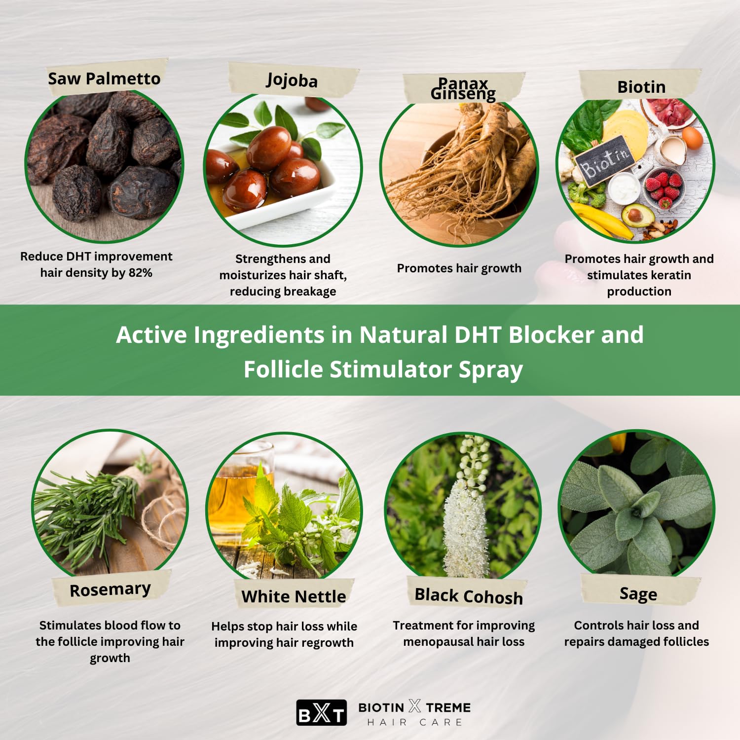 - Premium Natural Ingredients: Infused with Biotin, Saw Palmetto, Jojoba, and other potent natural extracts like Rosemary and Sage, our spray nourishes and revitalizes hair while avoiding harsh chemicals and hormones.