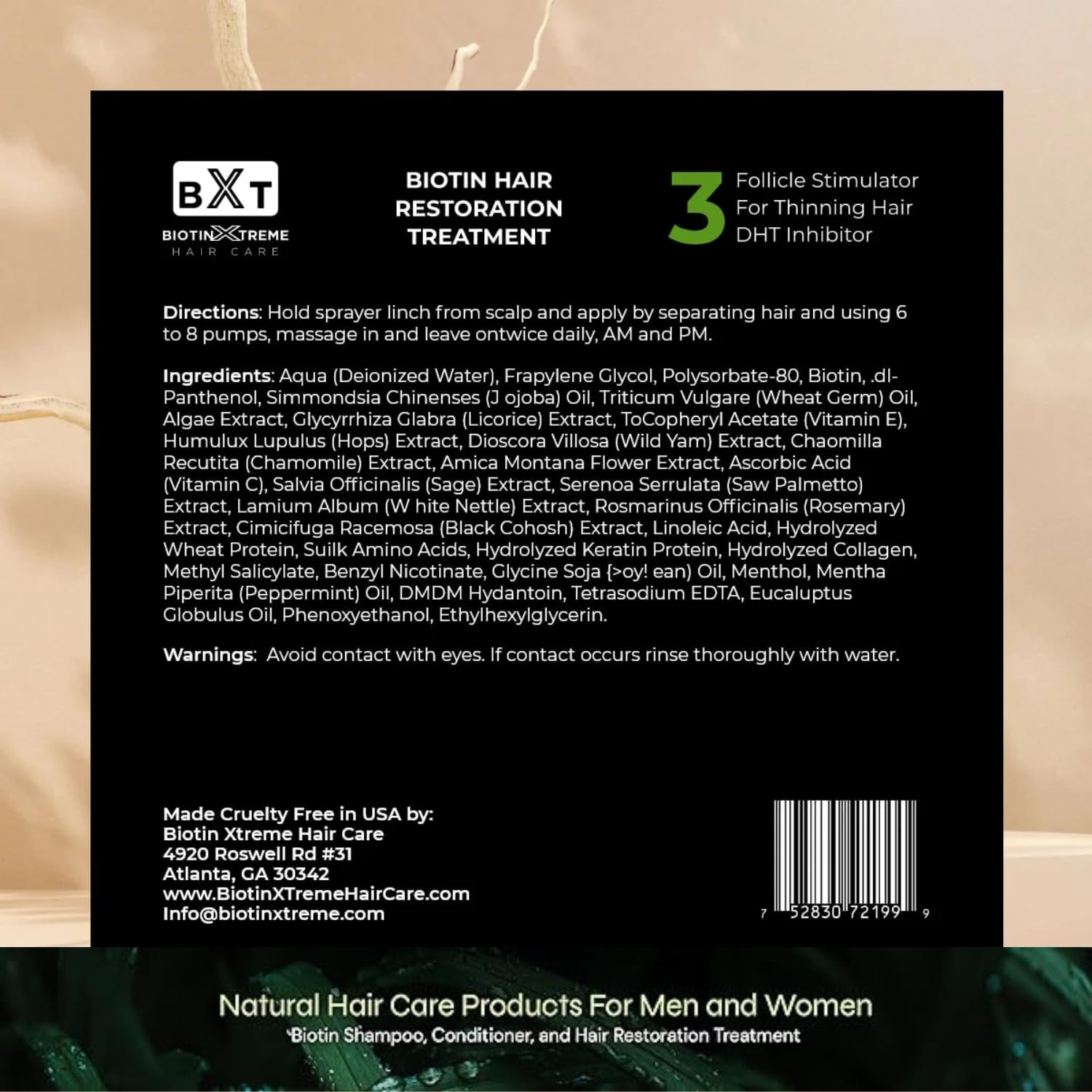- Biotin X Treme: Our founders have over 30 years of experience in the hair care and hair loss industry. We have developed a range of natural biotin products with certified natural ingredients, vitamins and minerals that helps in preventing hair loss, restoring thinning hair and improving hair growth. Our products are designed to give you the best possible results, so you can maintain fuller, thicker hair and reclaim your hair's natural strength.