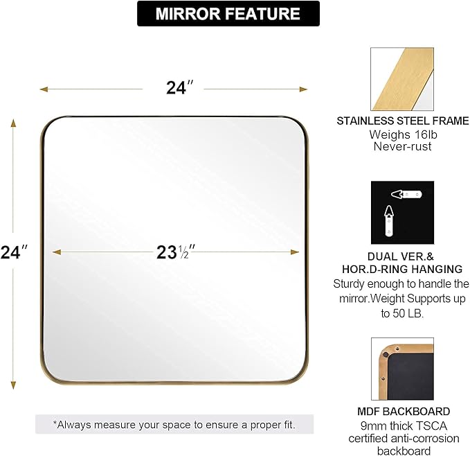 - EASY TO INSTALL: The square gold rounded corner mirror comes with four pre-installed reinforced D-ring hanging clips that are sturdy enough to handle the mirror. TIPS1.Mounting hardware is included to hang it both horizontally or vertically. 2.As we researched, the top reason for the return is INCORRECT SIZE ORDERED. Always measure your space to ensure a proper fit.