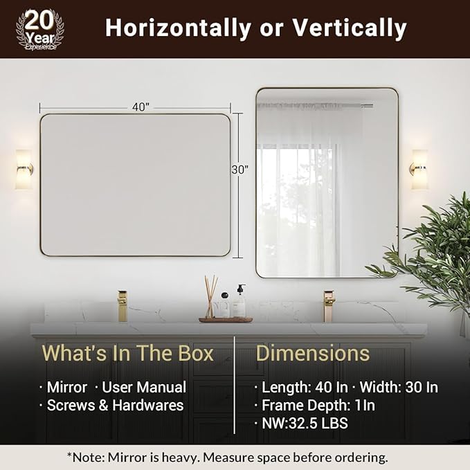 - 30X40” LARGE SIZE: 40X30” size is large enough for you to see entire figure. Features in brushed nickel, matte black, brushed gold and chrome finish,. Choose from one of our beautiful brushed gold bathroom mirror to complete your newly constructed or remodeled home.