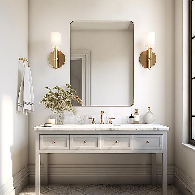 - AMAZING CRAFTSMANSHIP: This modern rounded corner brass frame mirror has the most classic brushed gold finish(No Rose Gold, No Yellow Gold), coming with 1 ”depth frame which is extremely minimalist. The plate glass mirror floats in the frame surrounded by a thin 1/12" gap. Use this brass mirror for bathroom, vanity mirror, or entry to add light and enhance the beauty of any room in your home.