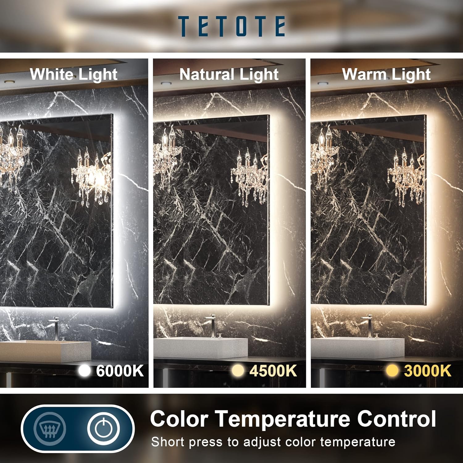 TETOTE 48 x 30 LED Backlit Bathroom Mirror with Light,3Color White/Warm/Natural,Anti-Fog Lighted Mirror,Dimmable,Vanity Mirror,Wall Mounted