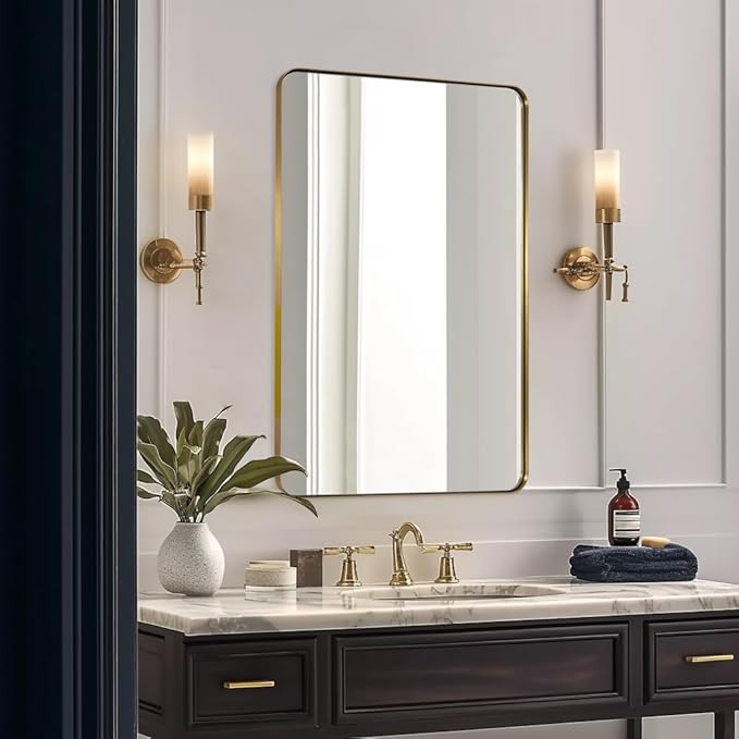 - AMAZING CRAFTSMANSHIP: This modern rounded corner brass frame mirror has the most classic brushed gold finish(No Rose Gold, No Yellow Gold), coming with 1 ”depth frame which is extremely minimalist. The plate glass mirror floats in the frame surrounded by a thin 1/12" gap. Use this brass mirror for bathroom, vanity mirror, or entry to add light and enhance the beauty of any room in your home.
