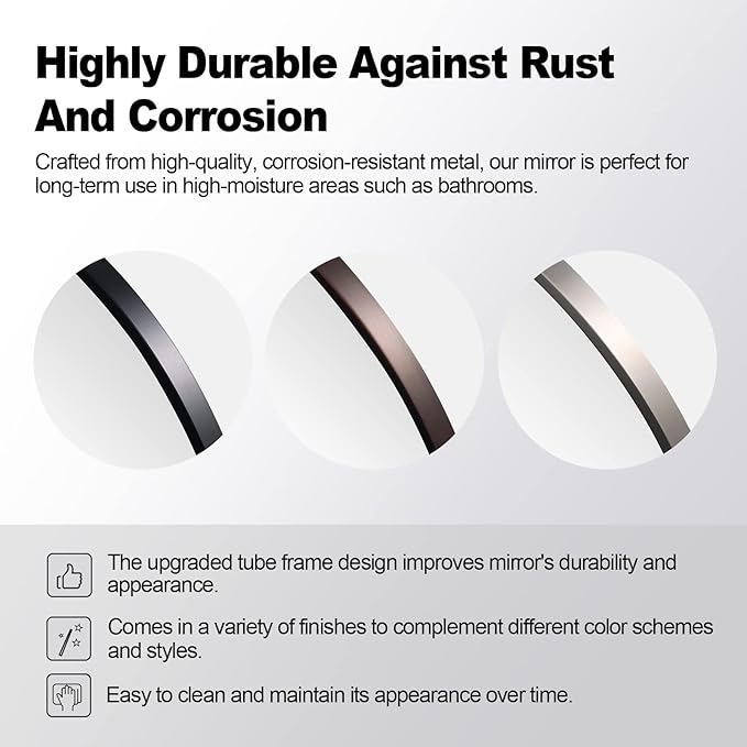 - Sleek Seamless Stainless Steel Frame: Enhance the beauty of your bathroom with ANDY STAR's mirror, featuring a seamless and robust stainless steel frame. Say goodby to damaged mirrors and unsightly seams, with a quality, and hassle-free option that complements any decor