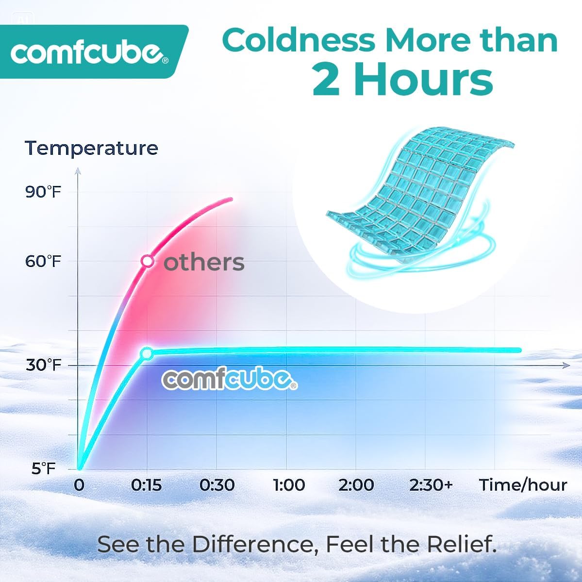 - Ultra Long Lasting Coldness - Comfcube ice pack uses patent ice boxes technology to stay cold up to 2 hours, and always keep a low temperature at which your skin feels comfortable, no need extra towel wrapping and won't cause frostbite or collect condensation.