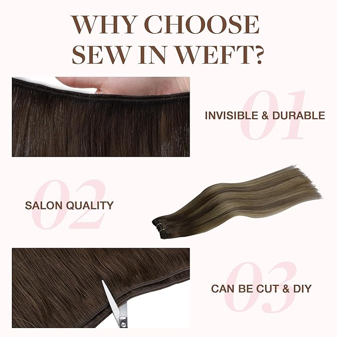 GOO GOO Sew in Hair Extensions Real Human Hair, Weft Hair Extensions Human Hair, 4/26/4 Balayage Chocolate Brown to Honey Blonde 20inch 105g, Weft Bundles Straight Silky Remy Hair