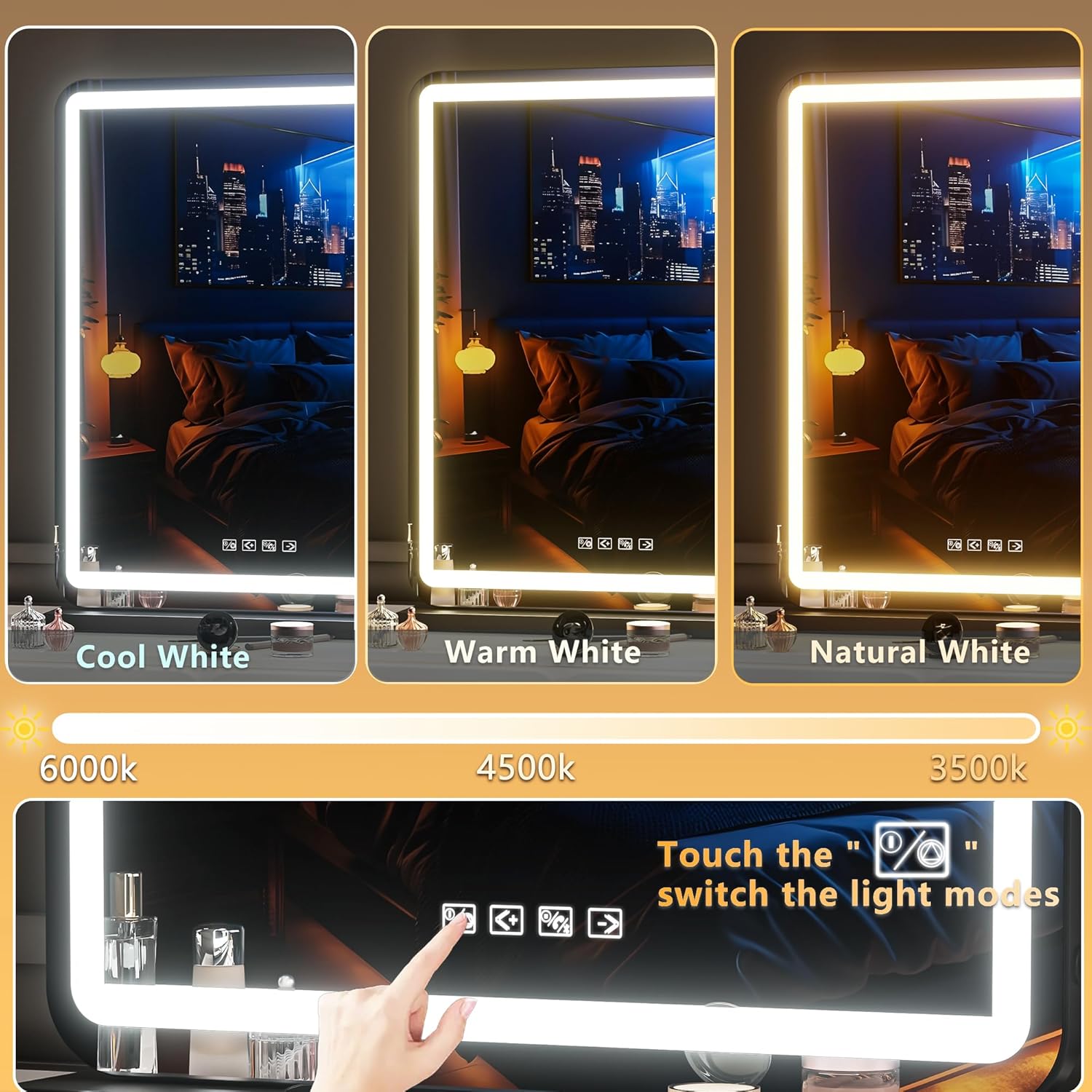 - đăBrightness Adjustable and 3 Color Lighting ModesăHASIPU lighted makeup mirror surrounded by 50,000 hours life Max 6000 Lumens high brightness LED Light Strip, with warm /natural /cold white three-tone settings, adjustable brightness 0%-100% can meet your personal makeup requirement.
