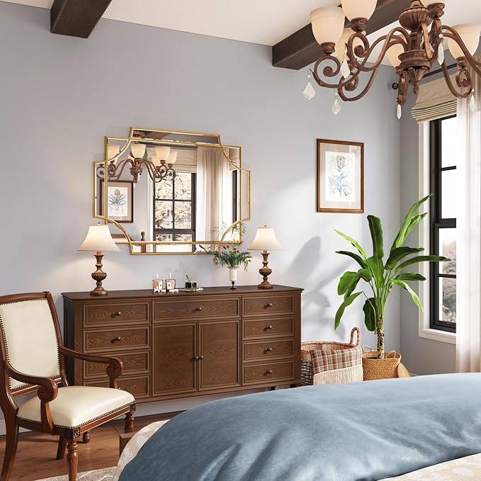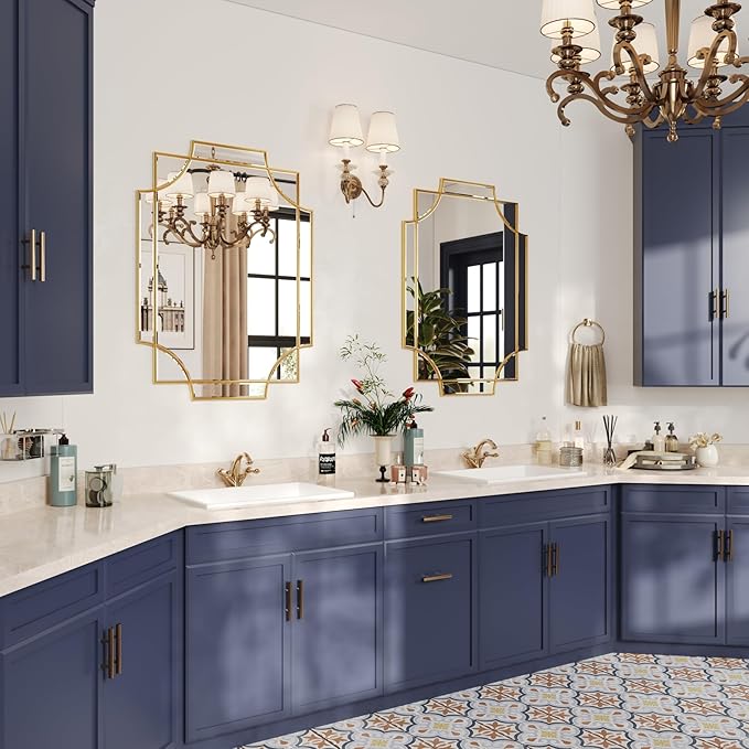 - UNTIQUE DESIGN. If your want some intricacies/interest to the pattern - not just a simple round or rectangle, this mirror will definitely be your perfect choice. Its sophisticated cutout corner accents along the inner and outer edges of the frame complete the look with added decorative detail. It will be a beautiful addition to any wall and an essential element in your home decor.