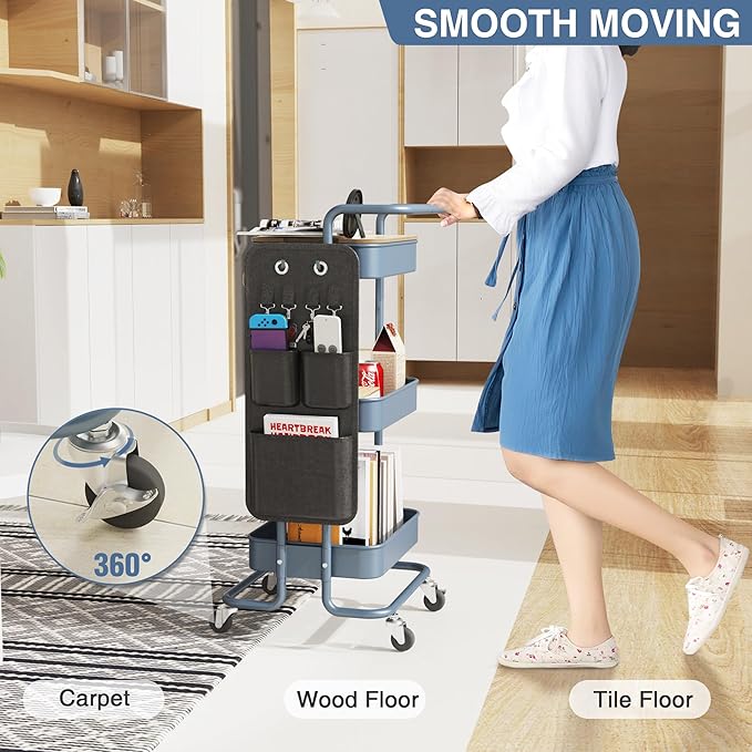 DTK 3 Tier Metal Utility Rolling Cart with Table Top and Side Bags, Metal Tray Storage Organizer Cart with Wheels, Art Craft Cart with 4 Hooks for Kitchen Bathroom Office Living Room (Blue)