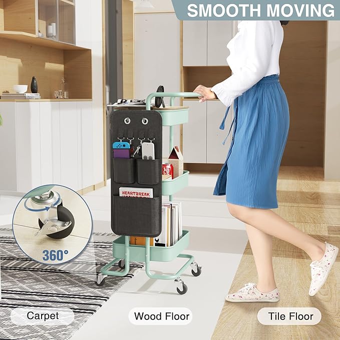 DTK 3 Tier Metal Utility Rolling Cart with Table Top and Side Bags, Metal Tray Storage Organizer Cart with Wheels, Art Craft Cart with 4 Hooks for Kitchen Bathroom Office Living Room (Green)