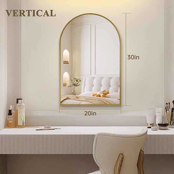- Brushed Gold Metal Frame: The gold arch mirror frame is made of aluminum alloy wire drawing technology, sturdy, sturdy, and rust resistant, designed specifically for long-term use. 45 degree beveled edge design to protect the mirror surface from falling off the frame.This wall mounted mirror can perform beautifully in both damp and dry environments.