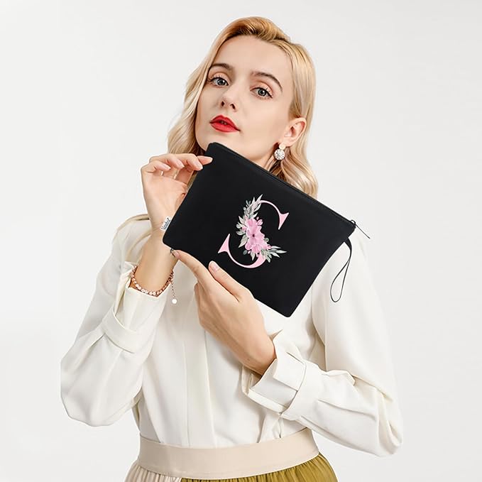 Vavabox A-Z Personalized Makeup Bag, Birthday Gifts for Women Mom, Gifts for Best Friend, Bride Bridesmaid Cosmetic bag (S, Black)