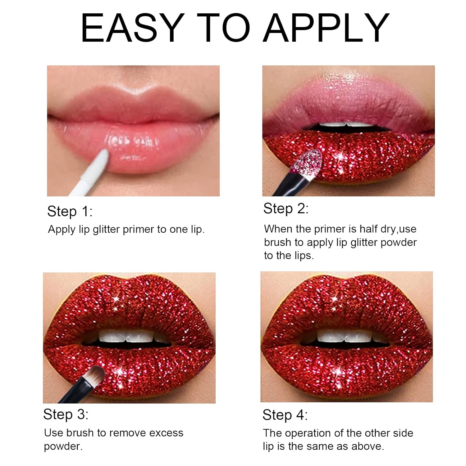 - 【Easy to Apply】This set comes with a clear lip gloss base, apply to lips before use, then use tool dipped in powder to apply directly on lips for a shimmery perfect lip finish.