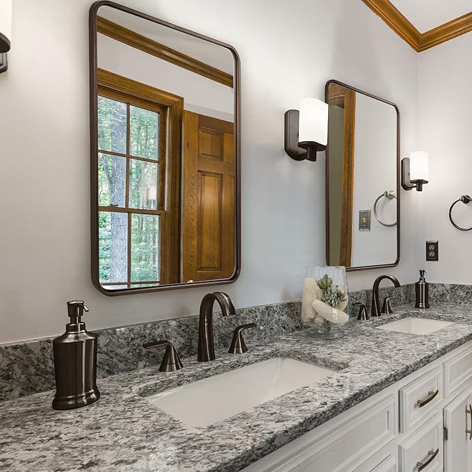 - Medium Size Ideal for Bathroom: At 28x36 inches, our bronze rectangle mirror is an ideal size for your bathroom. The modern sophistication of the brushed bronze finish and unique rounded frame design make this bronze wall mirror perfect for any decor style, from modern to farmhouse to rustic