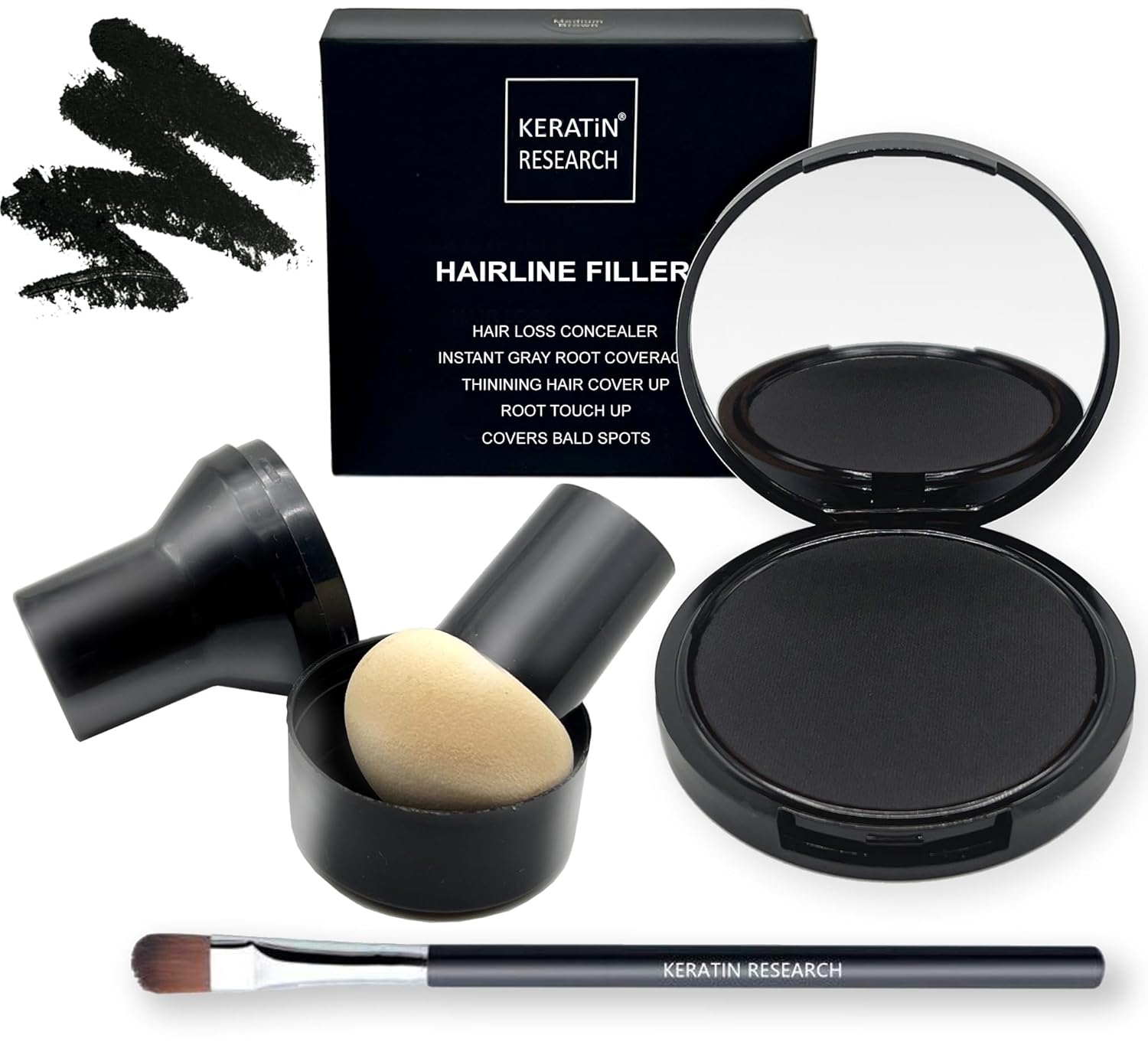 - ROOT CONCEALER- Keratin Research Hairline Filler, a Premium Root Cover Up, is your secret weapon for at home or on-the-go. Camouflage roots and grays instantly, giving you full great looking hair! The Cover Up Powder also conceals thinning hair and hair loss, for an instant look of healthy volume. Packaging includes a large mirror and a great mushroom applicator. Root touch up powder is resistant to rain, sweat, and wind.