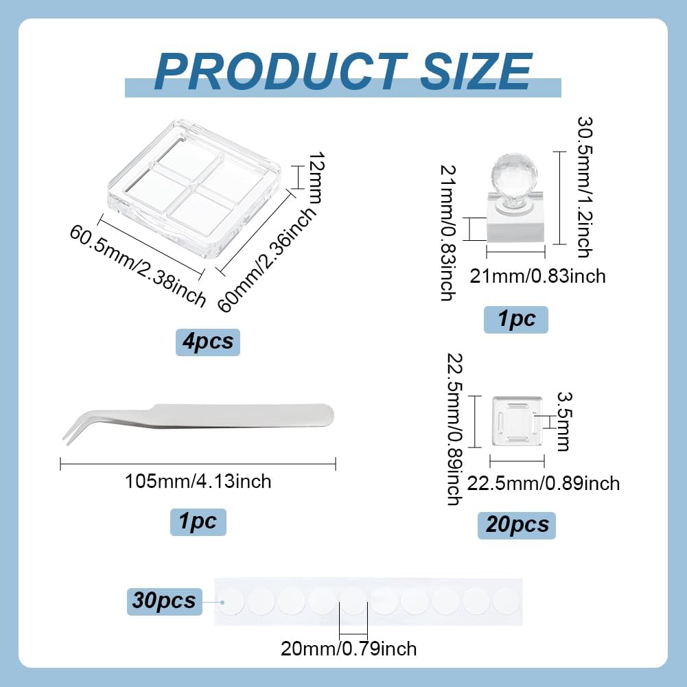 - Package Includes: Includes 4pcs eyeshadow boxes, 20pcs aluminum palettes, 30pcs PE film stickers with a embossing tool and stainless steel beading tweezer. Eyeshadow box is about 60.5x60x12mm/(2.38x2.36x0.47inch); square aluminum palette pans is about 22.5x22.5x3.5mm/(0.88x0.88x0.14inch).