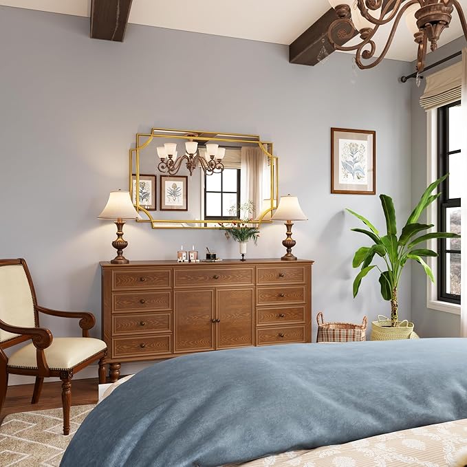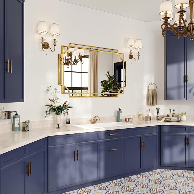 - UNTIQUE DESIGN. If your want some intricacies/interest to the pattern - not just a simple round or rectangle, this mirror will definitely be your perfect choice. Its sophisticated cutout corner accents along the inner and outer edges of the frame complete the look with added decorative detail. It will be a beautiful addition to any wall and an essential element in your home decor.