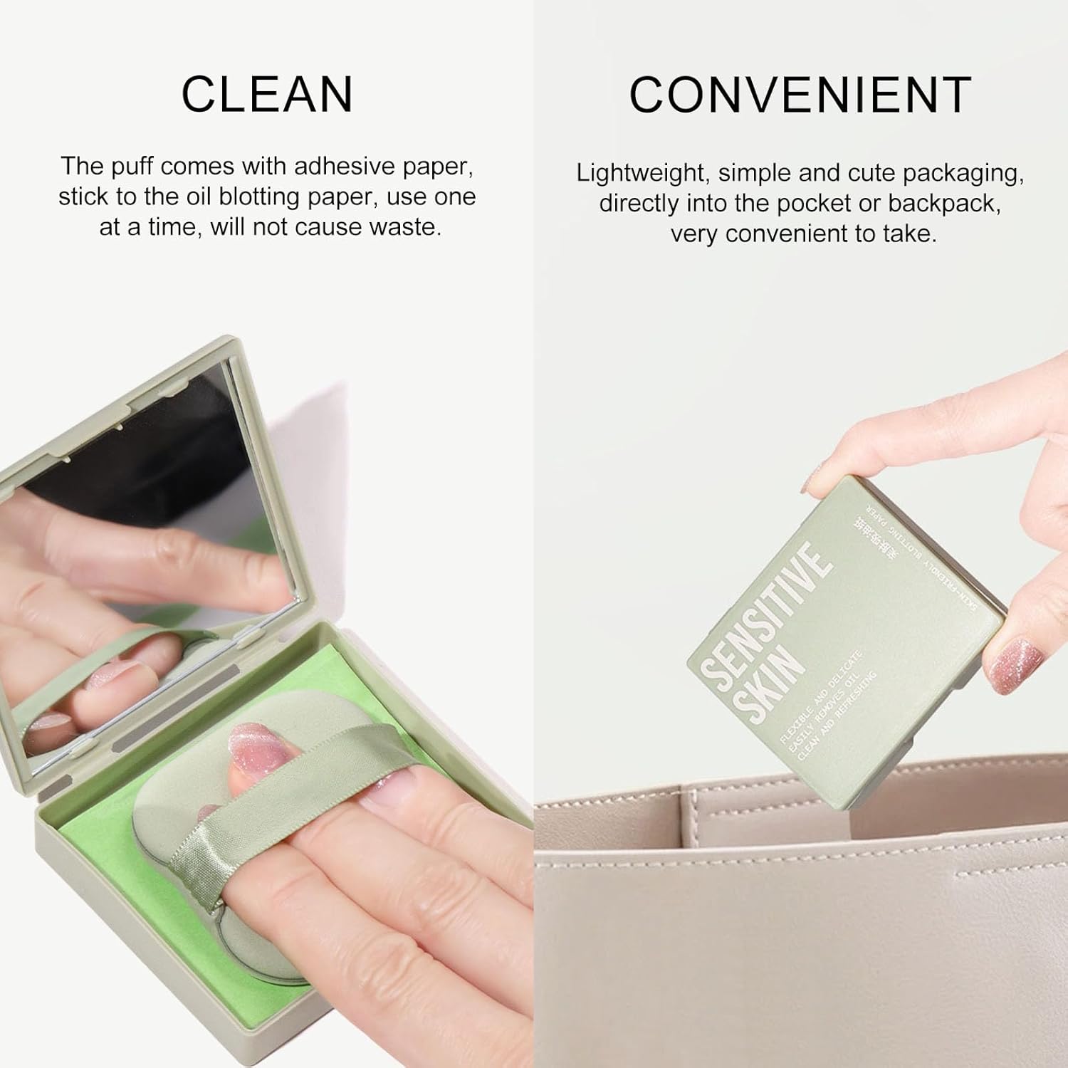 - 【Clean】The puff comes with adhesive paper, stick to the oil blotting paper, use one at a time, will not cause waste. Lightweight, simple and cute packaging, directly into the pocket or backpack, very convenient to take.