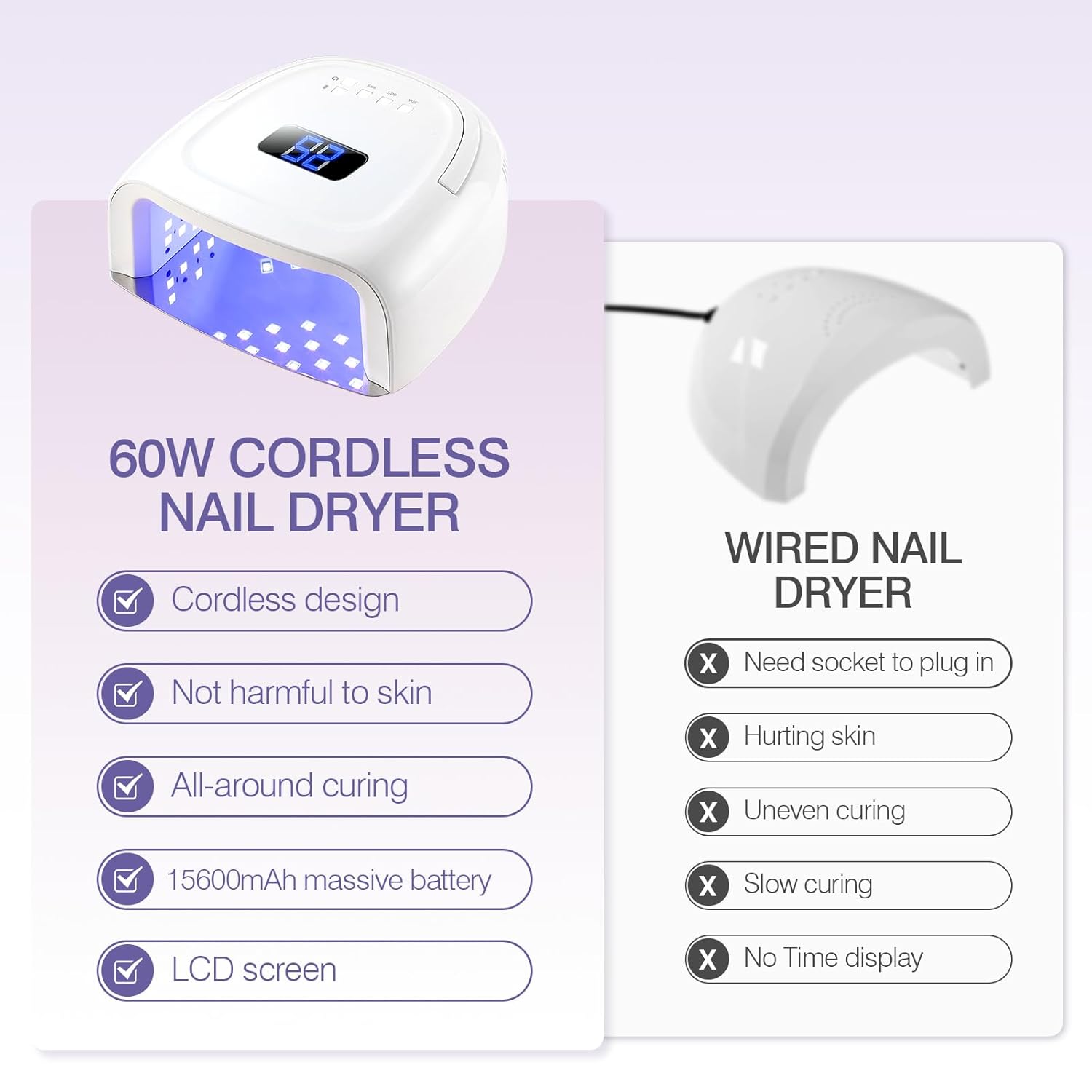 - 【42 Bulbs 60W UV Light for Nails】Illuminate your nail art world with our 60W cordless gel nail polish Lamp. Boasting 42 UV LED bulbs, it provides comprehensive, burn-free illumination, ensuring a skin and eye-friendly nail curing experience.