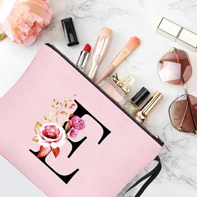 Vavabox A-Z Personalized Makeup Bag, Birthday Gifts for Women Mom, Gifts for Best Friend, Bride Bridesmaid Cosmetic bag (E, Pink)