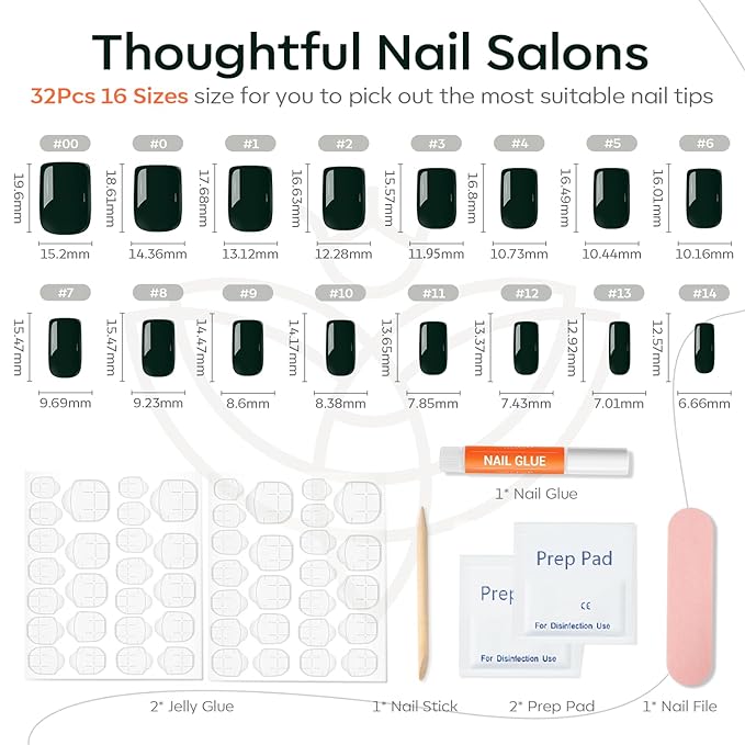 - 32 pcs Nails in 16 Sizes: The press on nails kit comes with 32pcs fake nails in 16 different sizes to suit each finger, each set comes complete with a nail glue, 2 sheets jelly adhesive tabs, double-sided nail file, cuticle stick, and prep pad