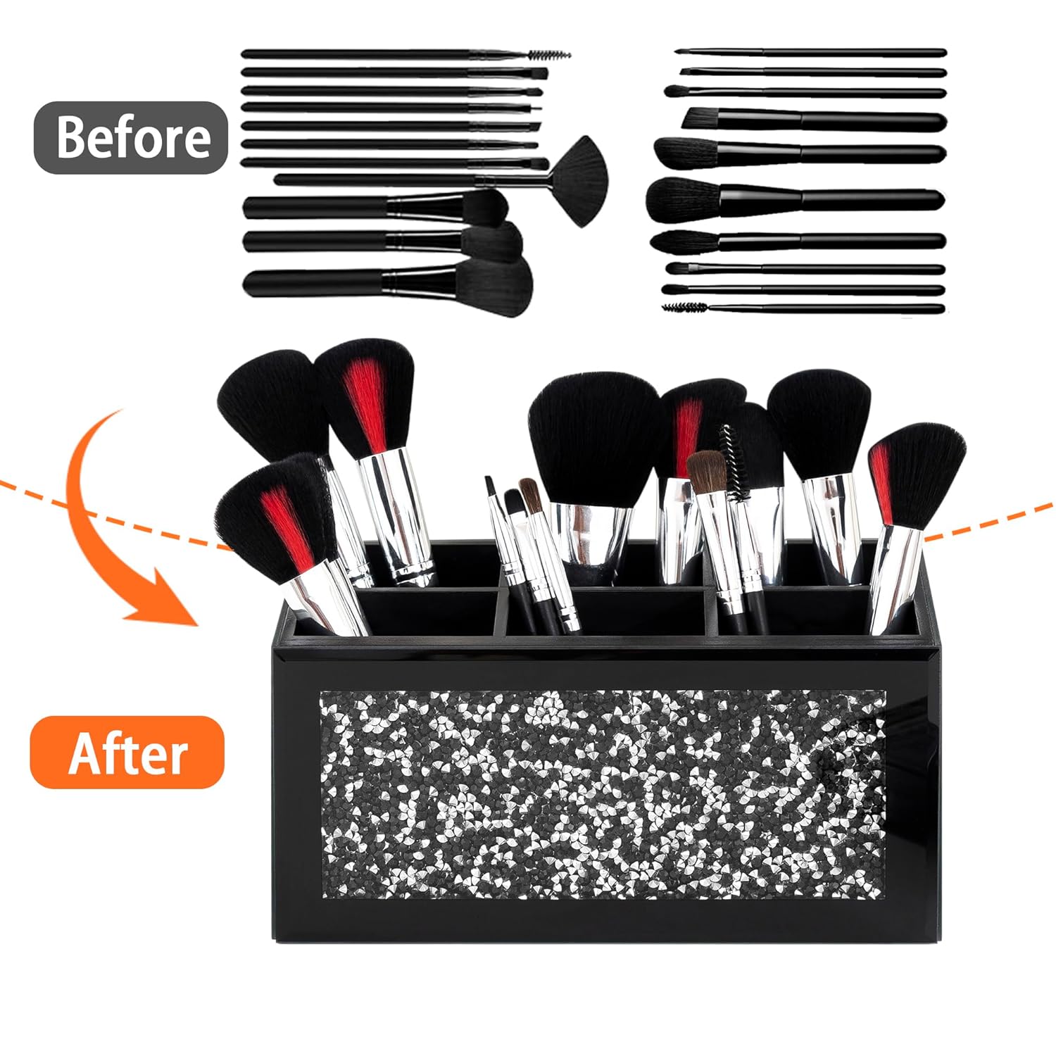 - Sleek Black Design with Crystal Detailing: The SHYFOY Makeup Brush Holder in a elegant black glass finish is perfect for adding a touch of glam to your bathroom. The 6-slot design, combined with front-facing crystal embellishments, offers an elegant solution for organizing your beauty essentials.