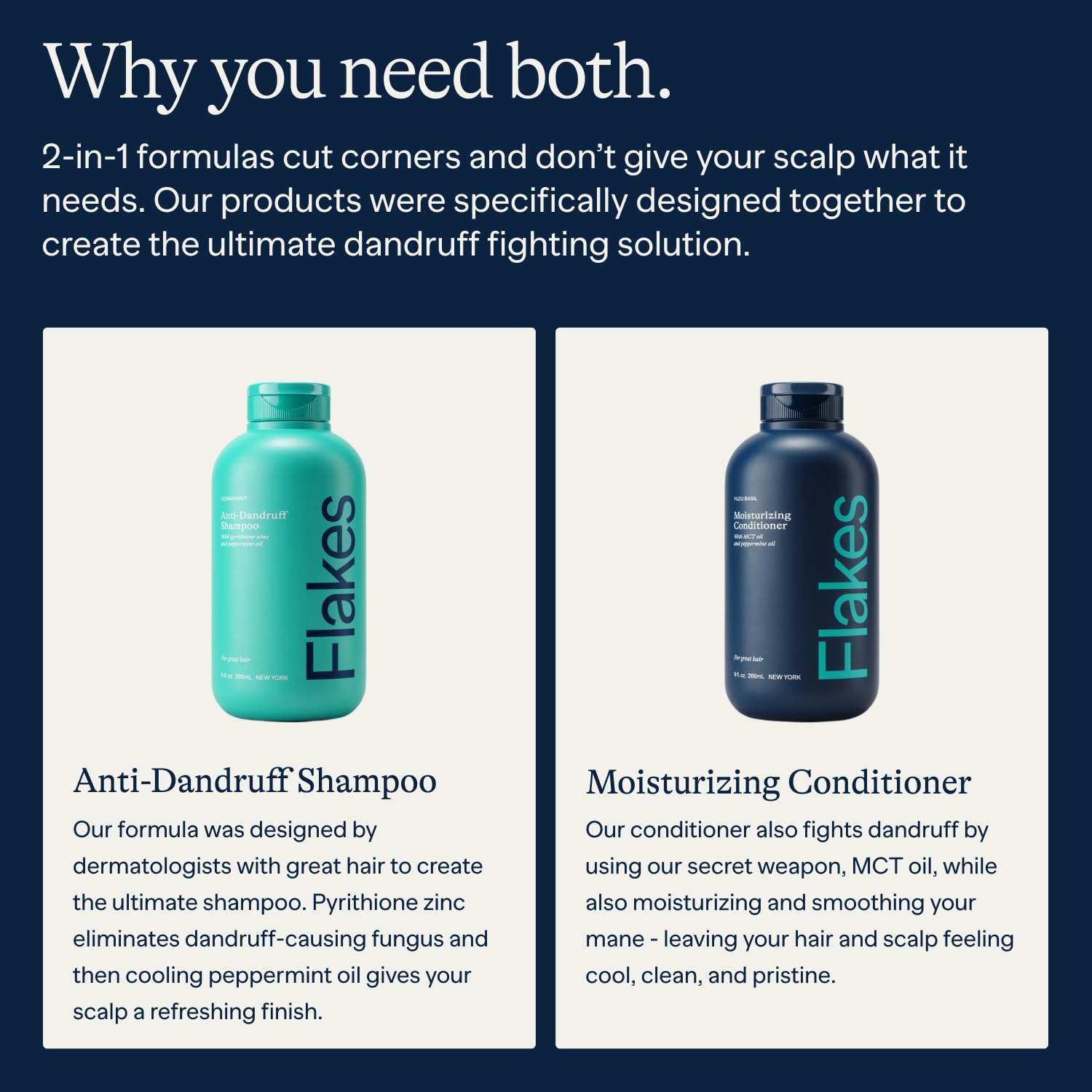 - Goodbye to Dandruff & Hello to Confidence: Drugstore brands have harsh ingredients that can irritate your scalp and make dandruff worse. Flakes shampoo for men uses 2x more of the active ingredient, pyrithione zinc, as legacy brands to get to the root cause of dandruff. Infused with MCT oil, our conditioner not only restores hair health but also adds an extra layer of dandruff defense.