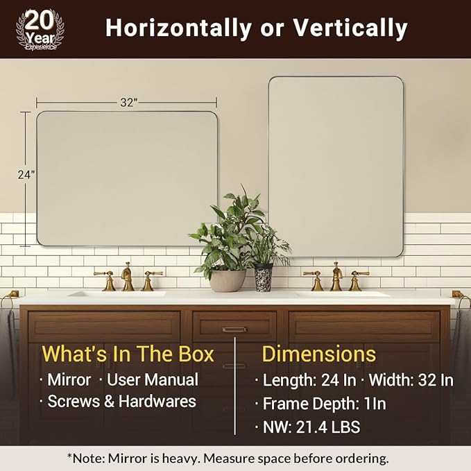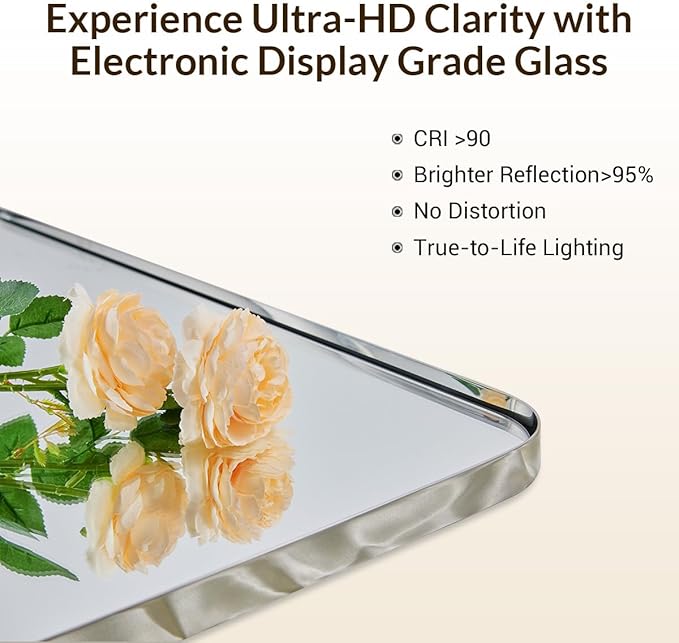 - STUNNING CLEAN LOOK: This chrome framed mirror for bathroom showcases a rounded rectangle design that is modern and clean, ensuring safety as well; The electronic display grade glass gracefully floats in the frame with a slim gap, presenting an elegant floating appearance which making it a must-have item