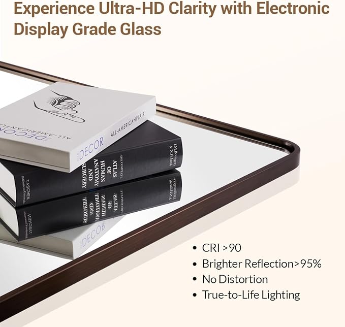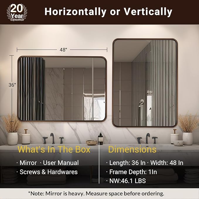 - Premium Quality: Our rustproof metal frame and shatterproof 4mm HD glass supported by a 9mm MDF backboard make for a safe and timeless bronze vanity mirror that weighs in at 46.10lbs