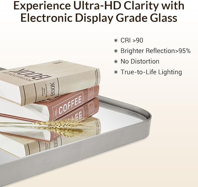- STUNNING CLEAN LOOK: This brushed nickel mirrors for wall showcases a rounded rectangle design that is modern and clean, ensuring safety as well; The electronic display grade glass gracefully floats in the frame with a slim gap, presenting an elegant floating appearance which making it a must-have item