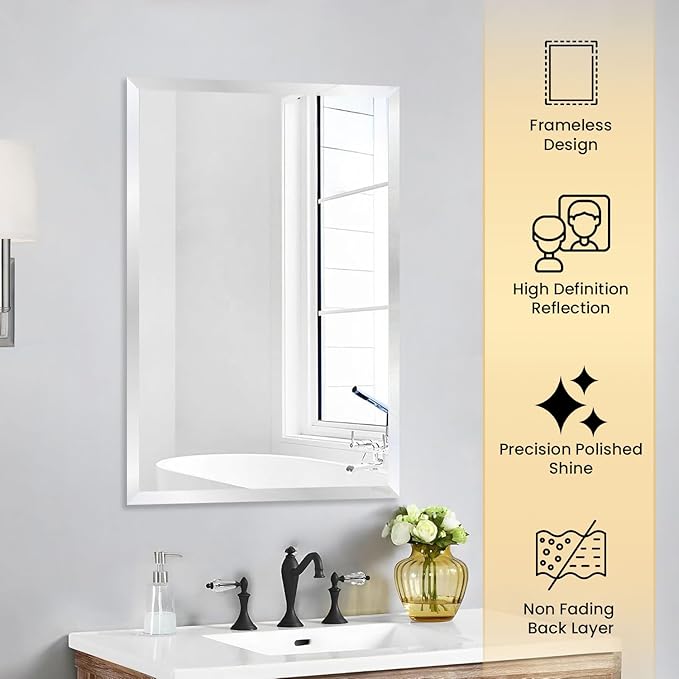 - ๐๐๐๐ฉ๐ญ๐๐๐ฅ๐ ๐๐๐ง๐ ๐ข๐ง๐ ๐๐ญ๐ฒ๐ฅ๐: Want to personalize your space? This frameless bathroom mirror can be hung both horizontally or vertically, depending on your preference. Whether you place frameless bathroom mirrors for over sink for a sleek bathroom upgrade or in your bedroom for a minimalist look, it will fit seamlessly into your dรฉcor and instantly elevate the space.