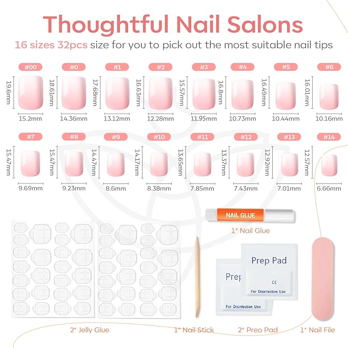 - 32 pcs Nails in 16 Sizes: The press on nails kit comes with 32pcs fake nails in 16 different sizes to suit each finger, each set comes complete with a nail glue, 2 sheets jelly adhesive tabs, double-sided nail file, cuticle stick, and prep pad