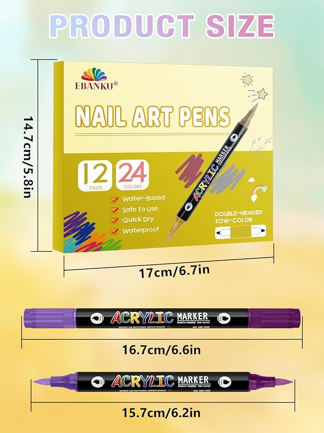 - 【Dual Pen Tips】You will get 12 Count-24 Colors Nail maker pens on our package. There are 24 daily colors for you to choose from: black, red, white, gray, yellow, cyan, blue, purple, pink, orange, gold, green and etc. The combination of classic colors can create elegant styles to meet your daily use and various needs.