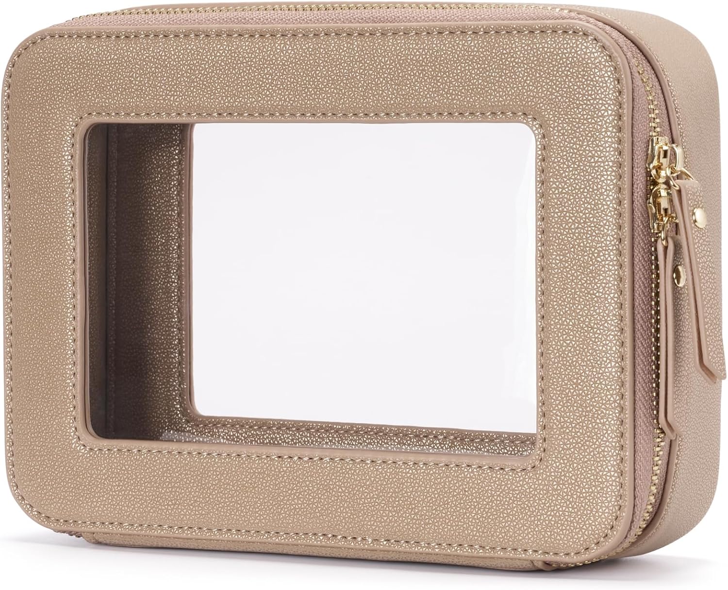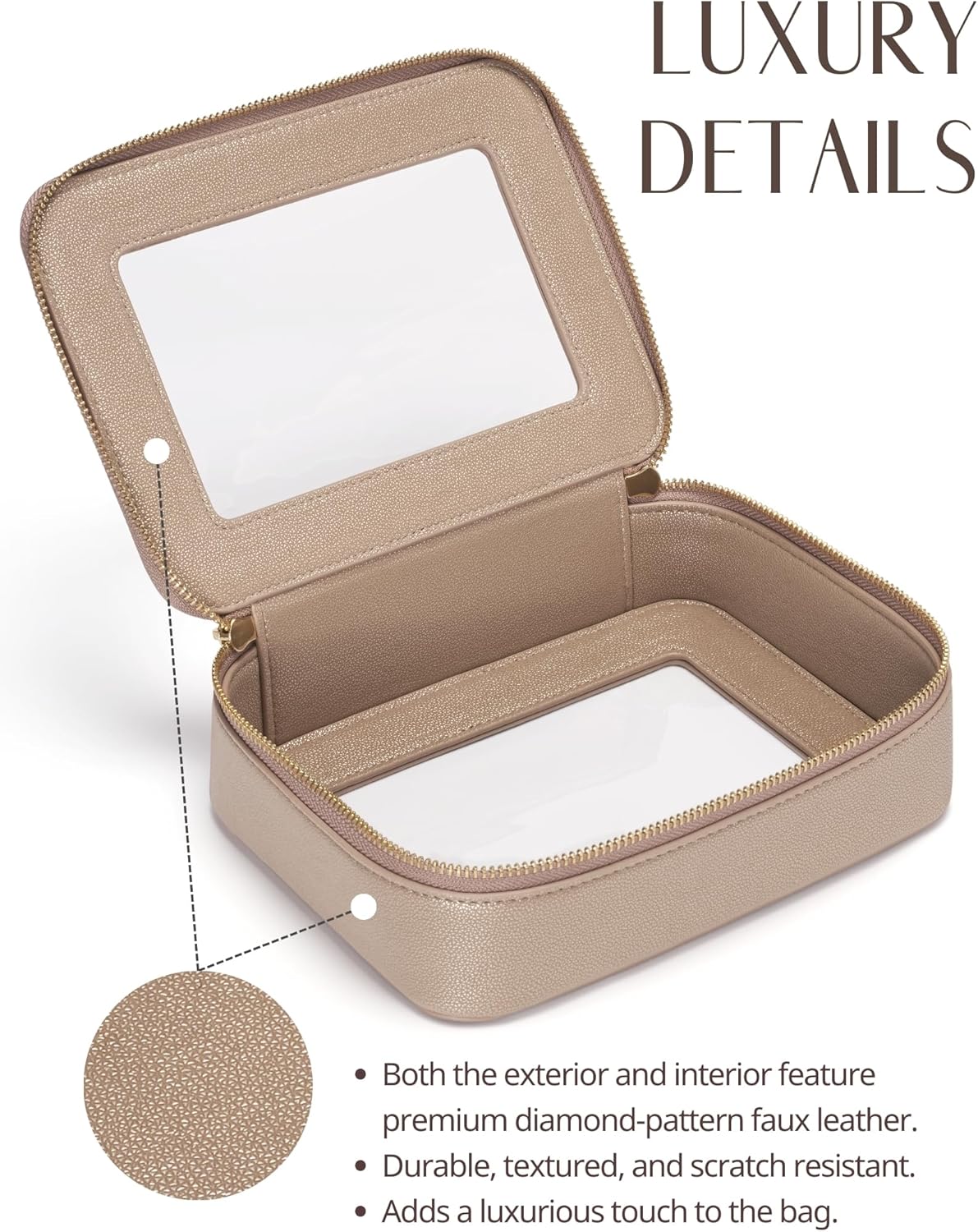- [Premium Material and Durability] – The clear cosmetic case, both the exterior and interior, is crafted from high-grade diamond-pattern faux leather, which is highly scratch resistant, durable and exceptionally easy to keep clean. It features a smooth zipper for secure closure, and elegant light gold metal hardware accents, adding a luxurious and sophisticated touch to the bag's overall design.