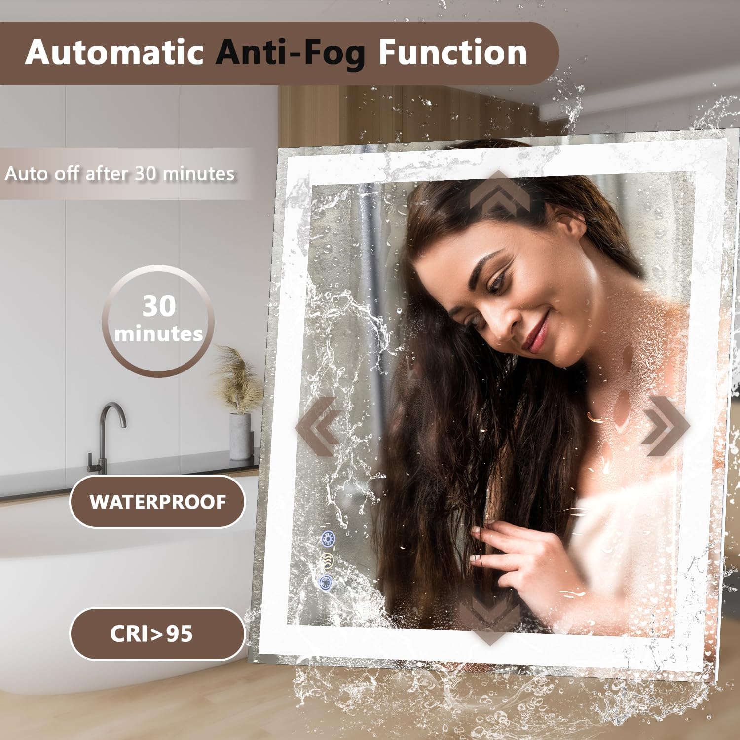 - 【Sealed Design, Waterproof & Moisture-Resistant】Fully sealed and IPX4+ rated, this mirror is specially built for humid spaces. It features certified waterproof components and grounding protection to prevent electric shock from leakage-safety you can trust. 196 LEDs/m and CRI>95 provide bright, uniform, and soft lighting without flicker or dark spots. Designed for bathroom safety but also perfect for bedroom, salon, or entryway-offering better protection and performance than standard mirrors