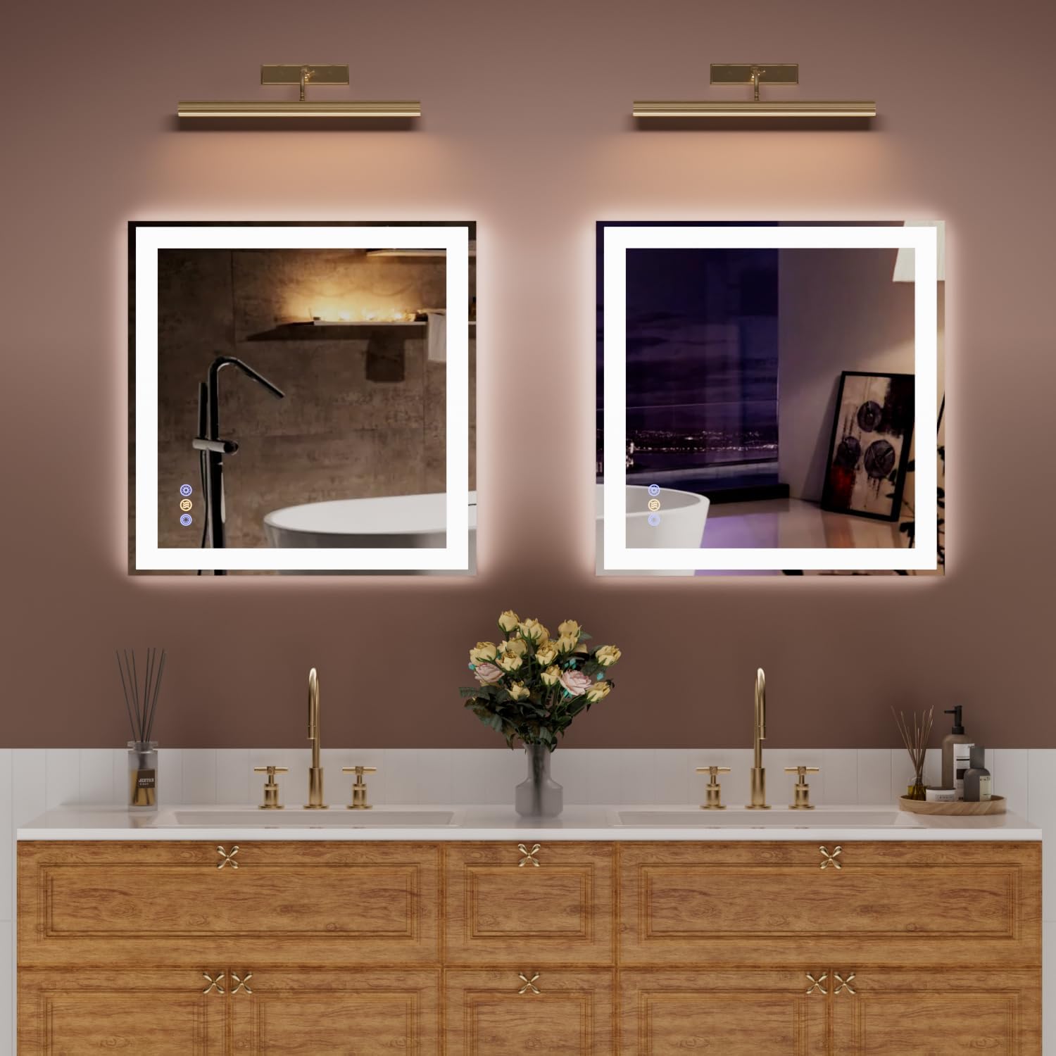 - 【Separate Front & Backlit Control with Dimming】This LED bathroom mirror features 3 adjustable color temperatures (3000K / 4000K / 6500K) and dimmable brightness (10%–100%). Front and back lights can be controlled separately. Short press to switch color temperature and turn lights on/off. Long press to adjust brightness. Unlike most mirrors, our button light can be turned off — no more glowing at night