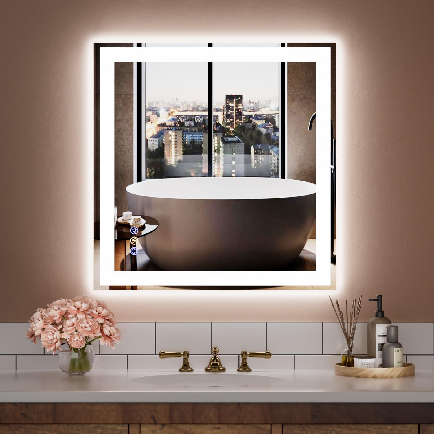 - 【36x36in Smart Mirror with Memory & Anti-Fog Function】This smart LED bathroom mirror is equipped with a memory function that recalls your last brightness color temperature and anti-fog settings, saving time every time you use it. The built-in fast-heating anti-fog feature activates a safe heating coil that begins clearing the mirror from the center outward within 3 minutes. Smart, safe, and efficient—designed for modern daily use