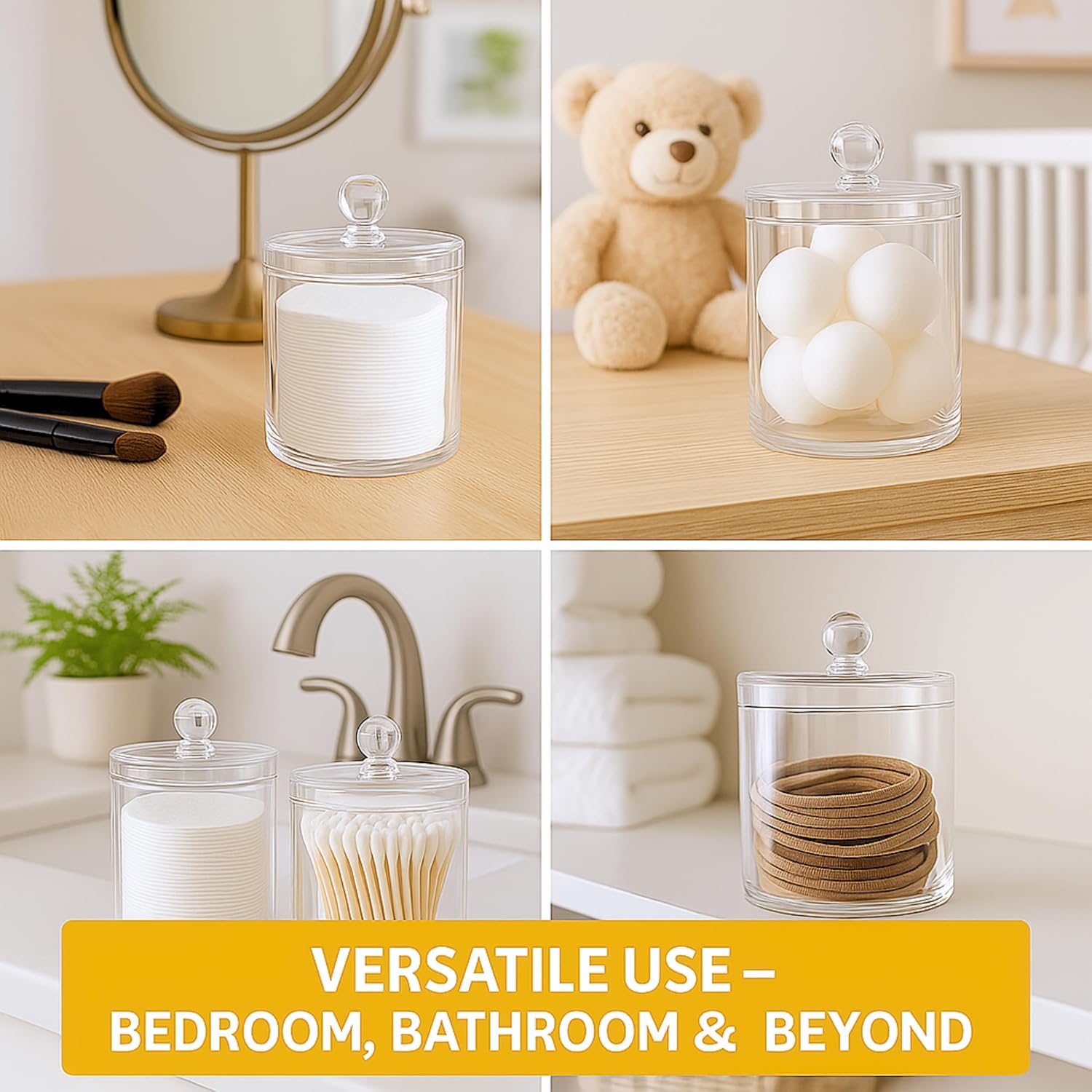 - CRYSTAL-CLEAR AND SMOOTH PLASTIC: This bathroom storage jars made of food-grade plastic, BPA-Free. This qtip storage is thick but clear plastic like glass or acrylic. Cotton swab holder offers a better resistance to cracking or breaking than glass does if dropped. The Qtip holder or small storage containers are also a perfect modern bathroom set. Bathroom countertop organizer or bathroom jars with lids transparent design improves visibility and easily see the contents inside.