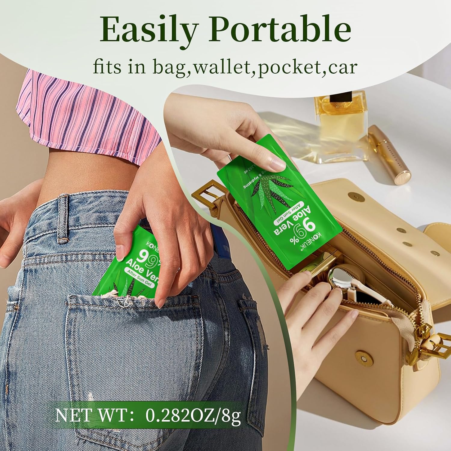 - 【99% Pure Aloe Vera Gel】This set of aloe vera gel has 50 packs,each pack is 0.282oz,each pack of aloe vera gel is individually packaged,which is very suitable for carrying around,when you use these aloe vera gel,you will feel very relaxed and cool,it quickly absorbed,and free of any sticky residue,leaving your skin smooth and moisturized
