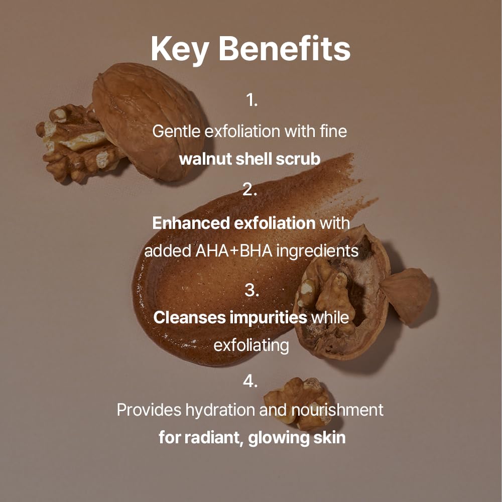 - [Gentle Exfoliation Without Irritation] Harsh scrubbing can strip away even the healthy layers of skin, leading to sensitivity. No need to worry—finely ground walnut shell particles gently remove only dead skin cells without causing irritation.