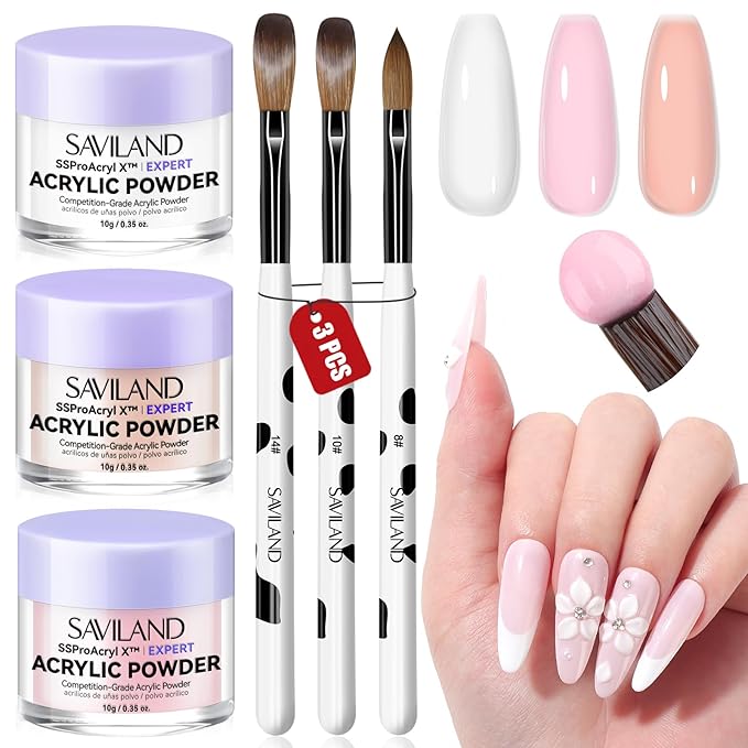 - SAVILAND Acrylic Nail Starter Kit: Includes 3 colors of Keratin acrylic powders (white, pink, nudes) and size 8, 10, 14 professional acrylic nail brushes for acrylic application — covers 90% of your daily acrylic nail art needs with precision and control