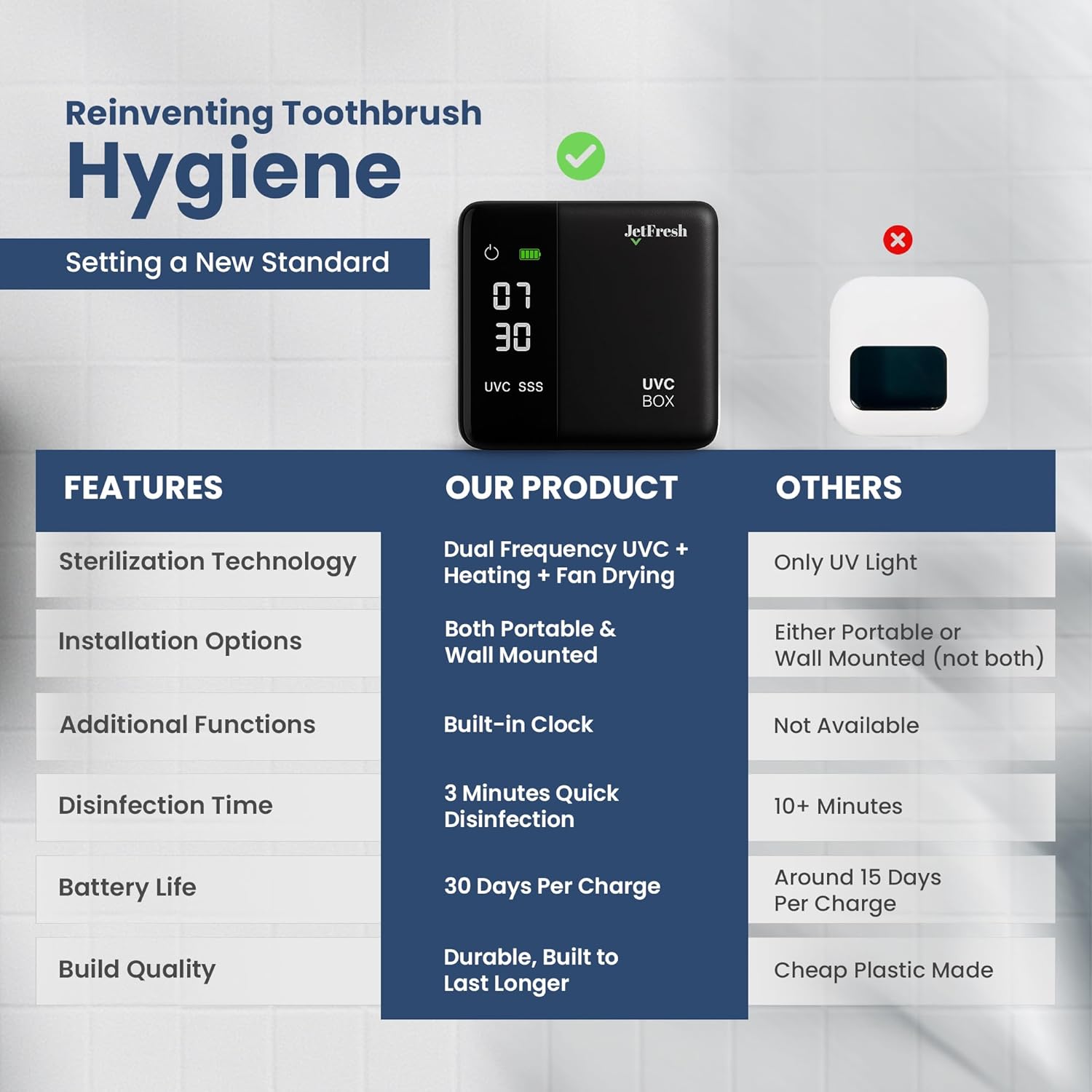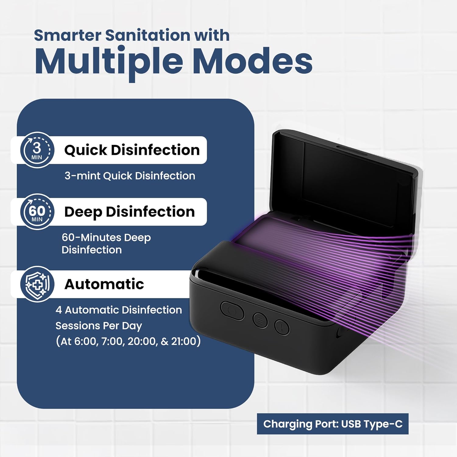 - Cordless, Rechargeable & Travel-Friendly : This compact toothbrush holders UV sanitizer Also works as a protective travel case. Its 650mAh battery lasts up to 30 days per charge and recharges in just 1.5 hours using a Type-C cable, perfect for home, office, or on-the-go.