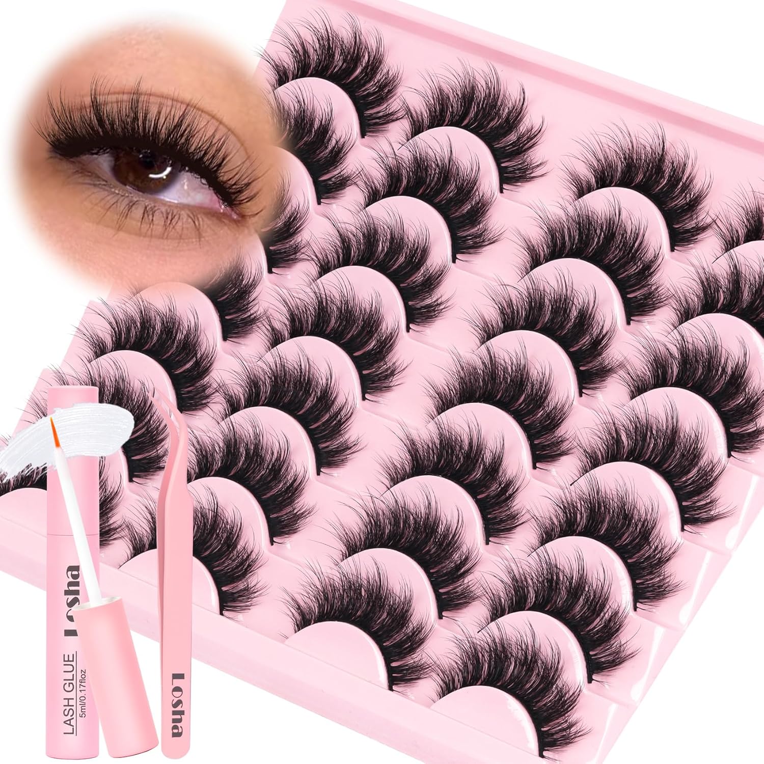 Losha Lashes Fluffy False Eyelashes 5D Volume Eye Lashes Kit with Lash Glue and Lash Tweezers 14 Pairs Vegan Fake Eyelashes Soft Faux Mink Lashes Pack (Thrives)