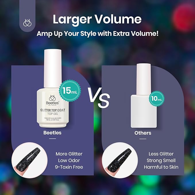 - Beetles Glitter Gel Top Coat: Long-lasting for 28+ days with perfect sparkle and shiny. A flexible topcoat avoids nicks, chips, or smudges. This is perfect for the holidays.