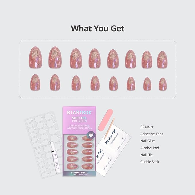 BTArtbox Press On Nails Short - Pink Cat Eye Almond Press On Nails with Glue for Women, Opaque Soft Gel Glue On Nails in 16 Sizes - 32 Stick On Nails Kit, Tassel Shine