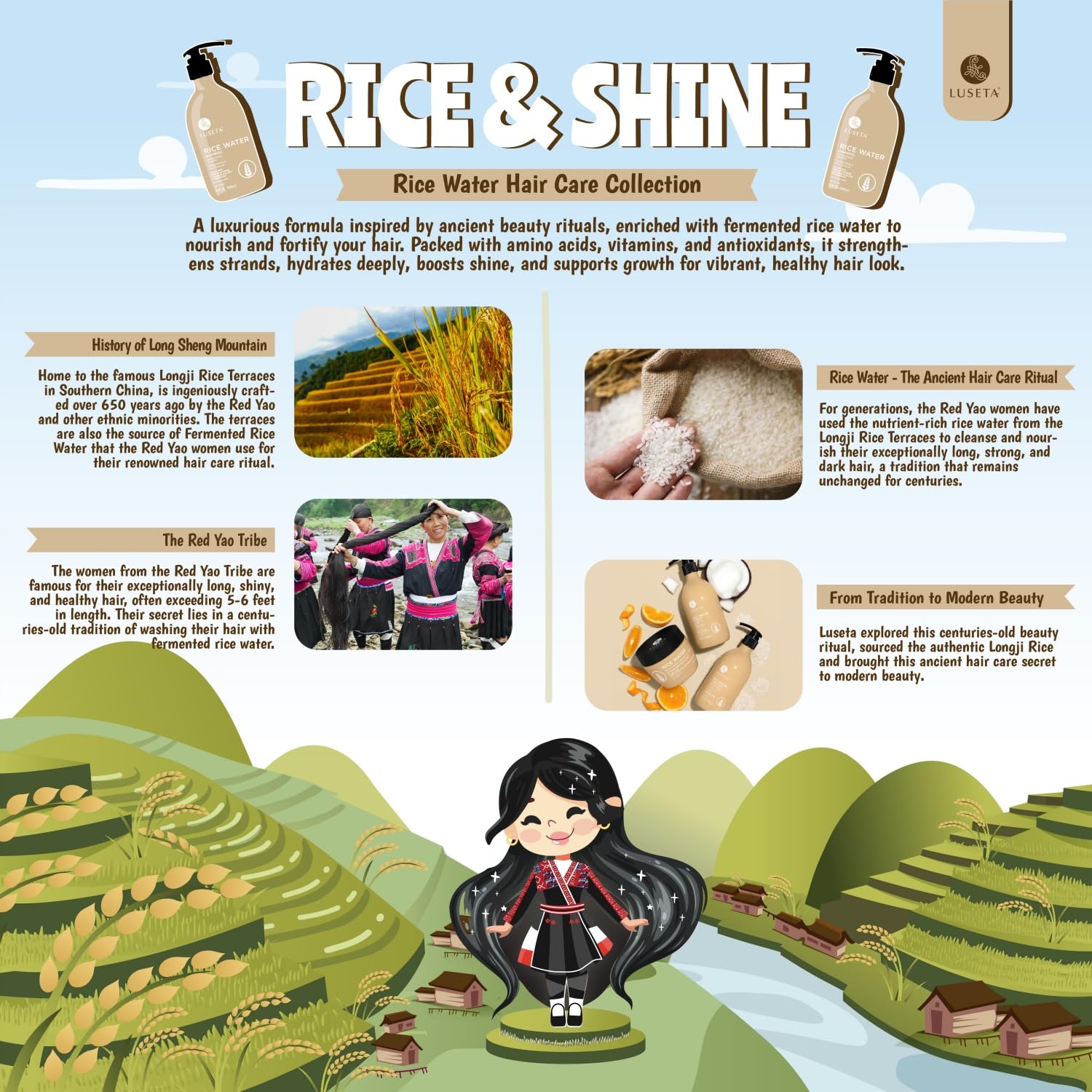 - Ancient Rituals, Radiant Hair: Inspired by traditional Asian haircare rituals, our Rice Water Shampoo and conditioner set harnesses the power of fermented rice water to strengthen, hydrate, and revitalize hair. Experience silky, resilient strands with a natural shine and effortless softness.