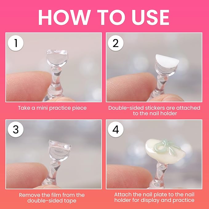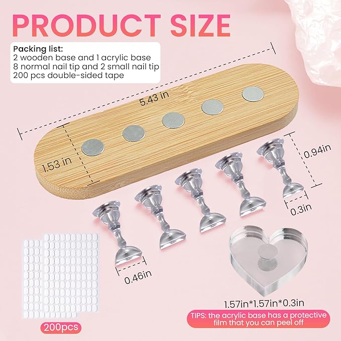 • Product Specification: The set includes two wooden magnetic nail practice stand (each with a base and five nail tip holders) that can be used as display racks, a heart-shaped acrylic gel nail polish holder for more complex nail designs (the acrylic base has a protective film that you can peel off) , and 200 pieces of double-sided tape. These are enough for you to practice using